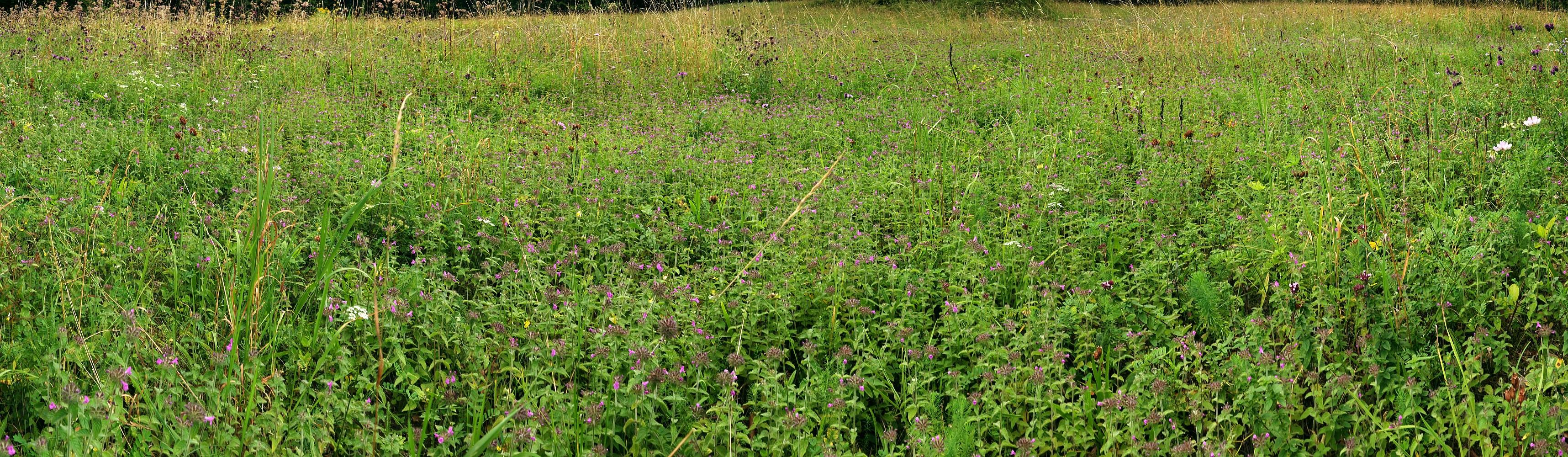Auf dieser mageren Waldwiese hat sich vor allem Wirbeldost (Clinopodium vulgare) massiv ausgebreitet. Der Name erklärt sich dadurch, dass die dunkelrosa gefärbten Lippenblüten nach allen Richtungen aus dem Blütenköpfchen herausstehen. Die Pflanze wächst häufig an Waldrändern und auf trockenen Wiesen. August 2025.