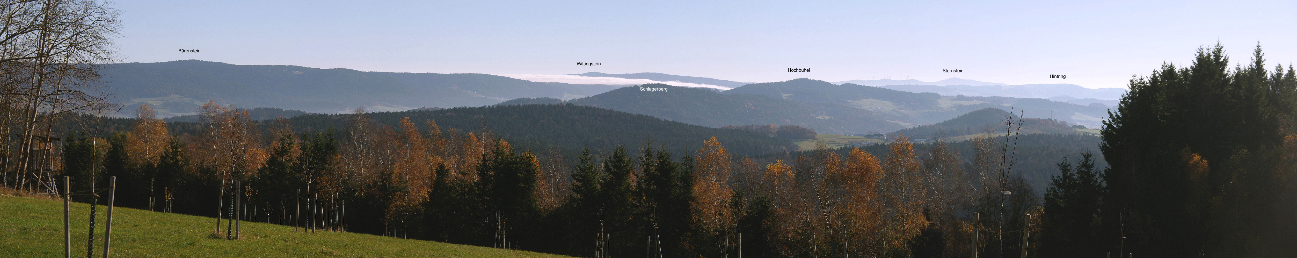 Die parkartige Landschaft auf der Joslplatte bei Thalberg (siehe auch folgendes Panorama) gewährt da und dort etwas Aussicht, hier nach Osten ins Mühlviertel. Anfang November 2025. Zurück Weiter