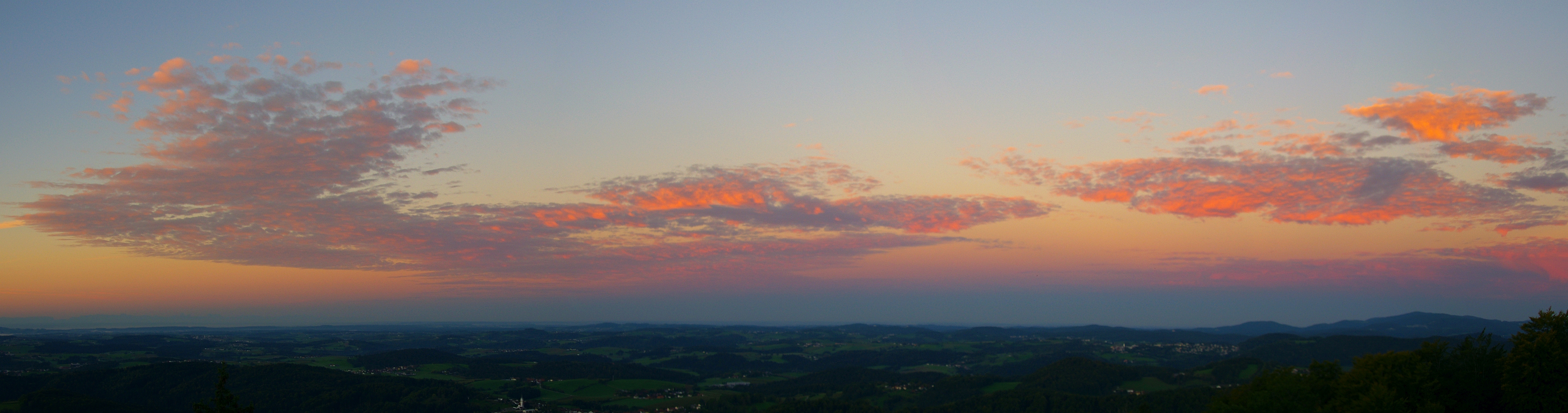 Ein Blick vom Freyunger Geyersberg über das Passauer Land und das Dreiburgenland am Morgen mit den beleuchteten Wolken als Hauptmotiv. Rechts der Sonnenwald mit dem Brotjacklriegel. Links unten ist am Horizont der Paß Lueg mit Tennengebirge und Hohem Göll erkennbar. September 2025.