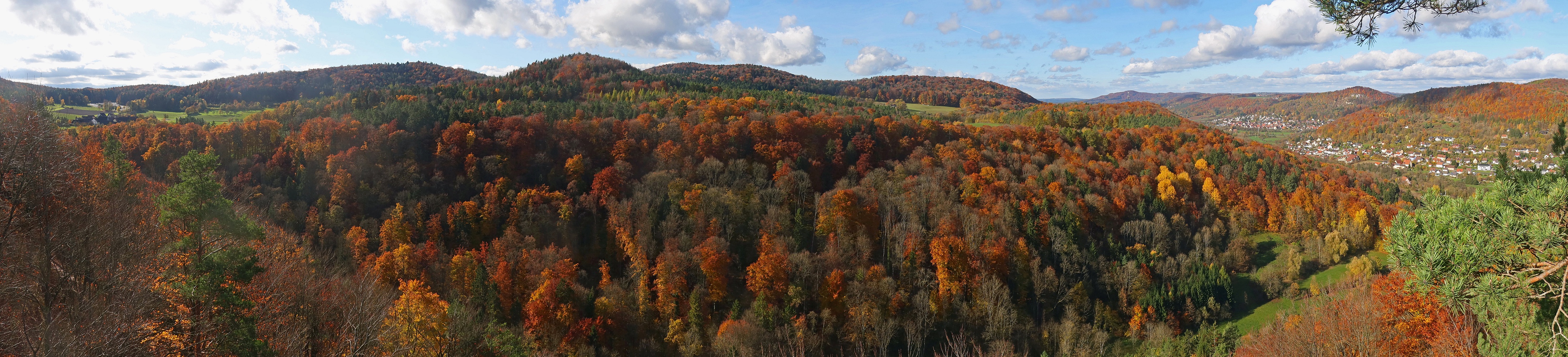 Nach einem Sommer-(hier) und einem Frühlingsbild (hier) von der Pommelsbrunner Mühlkoppe auch noch ein Panorama im Herbst, das farblich natürlich noch mehr zu bieten hat. Ende Oktober 2025. Zurück Weiter