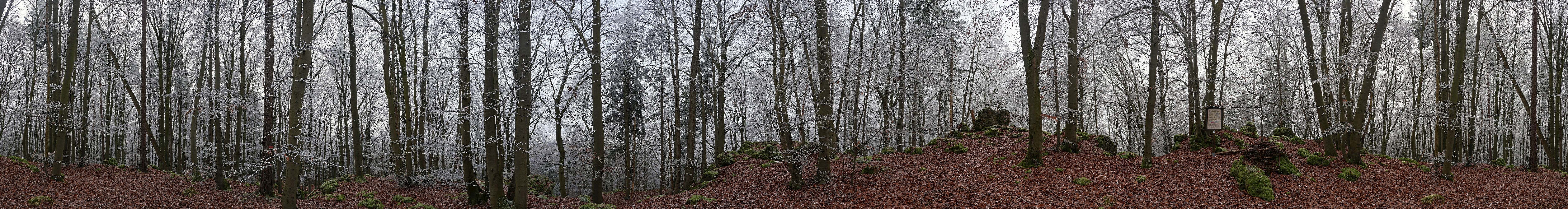 Der Hochberg bei Mittelburg ist mit 620m die höchste Erhebung zwischen Högenbach- und Förrenbachtal. Sein Gipfel war ein keltisches Heiligtum ("Akropolis der Kelten" auf der sichtbaren Infotafel). Im Winter bei Raureif wirkt das Gipfelplateau, zu dem ein archäologischer Rundweg führt und das keinen Ausblick bietet, am eindrucksvollsten. Dezember 2025.
