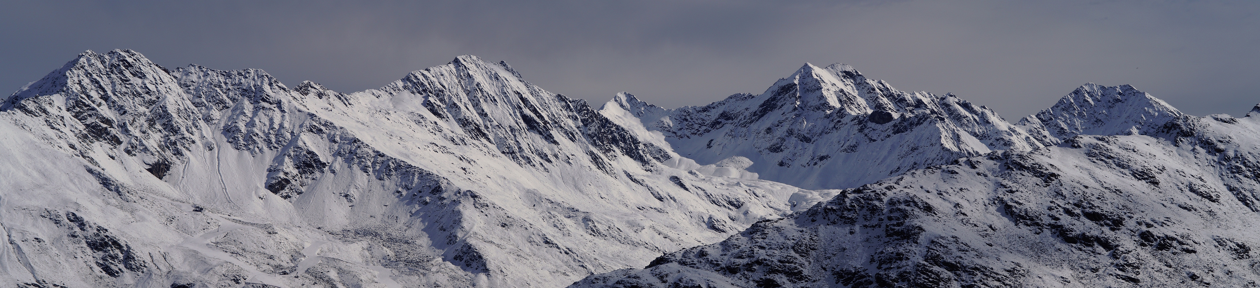 Ein Teleblick von oberhalb des Arlbergpasses zu der Bergkette östlich des St. Antoner Moostals, im Anschluss an das links unten sichtbare Rendl-Skigebiet. Von links nach rechts: Vordere Rendlspitze, Riffelspitze, Kreuzjochspitze, Madaunspitze und Seßladspitze. Oktober 2024.