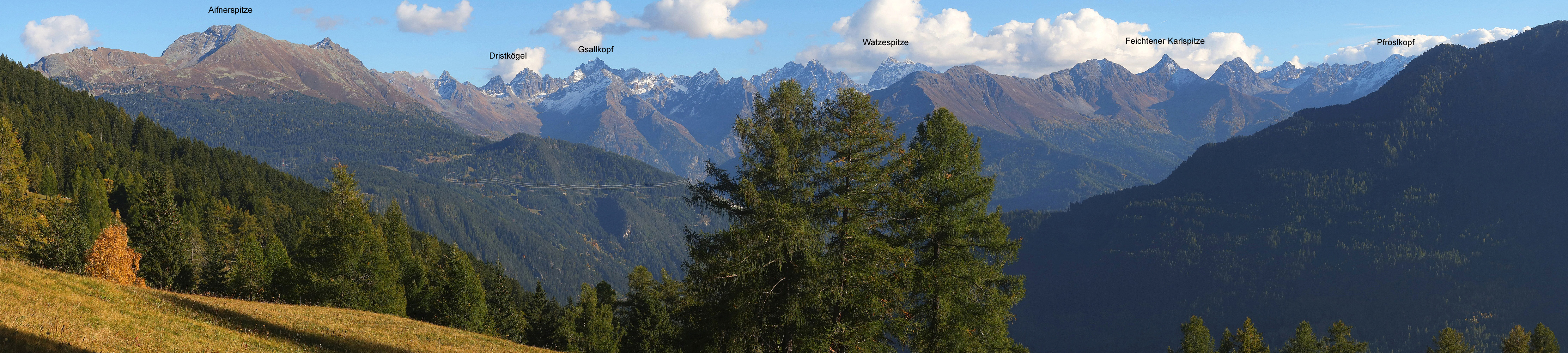 Oberhalb der Siedlung Spils in der Gemeinde Fließ im Tiroler Oberland geht der Blick von den Almwiesen zum vorderen Kaunergrat und Glockturmkamm. Oktober 2025. Zurück Weiter
