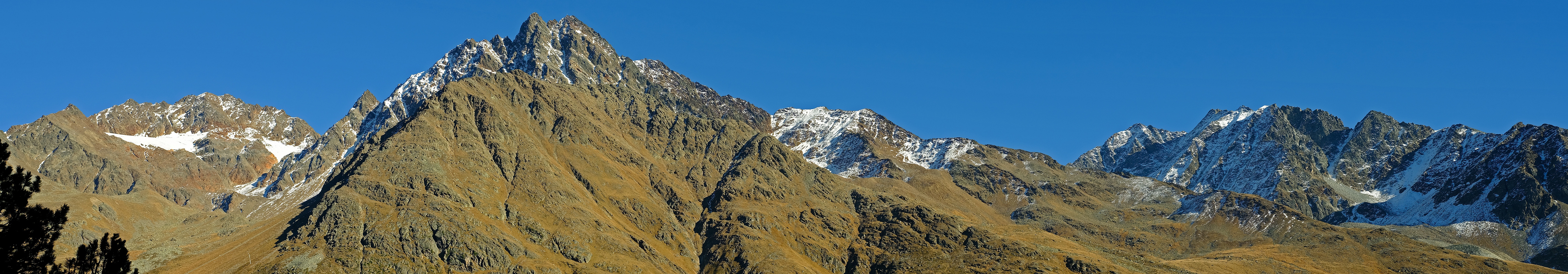 Die Gruppe der Ölgrubenspitzem im hintersten Kaunergrat, gesehen aus der Gegend des Gepatschhauses. Der höchste Gipfel ist die doppelgipflige Vordere Ölgrubenspitze (3456m) links der Mitte, rechts das breite Massiv der Hinteren Ölgrubenspitze (3296m). Ganz links noch die Bliggspitze (3454m). Oktober 2025.