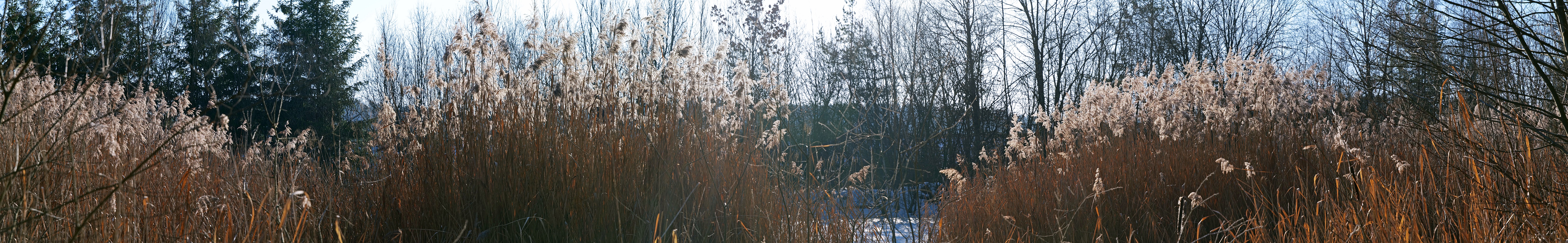 Ein Bestand von Gewöhnlichem Schilf (Phragmites australis) an einem kleinen Weiher im Winter. Der Winter ist die Jahreszeit, in der die Pflanze ihren Samen ausstreut (Windverbreitung), der erst im Dezember reift. Die Ähren an den abgestorbenen Halmen leuchten hier im Gegenlicht auf. Januar 2026.