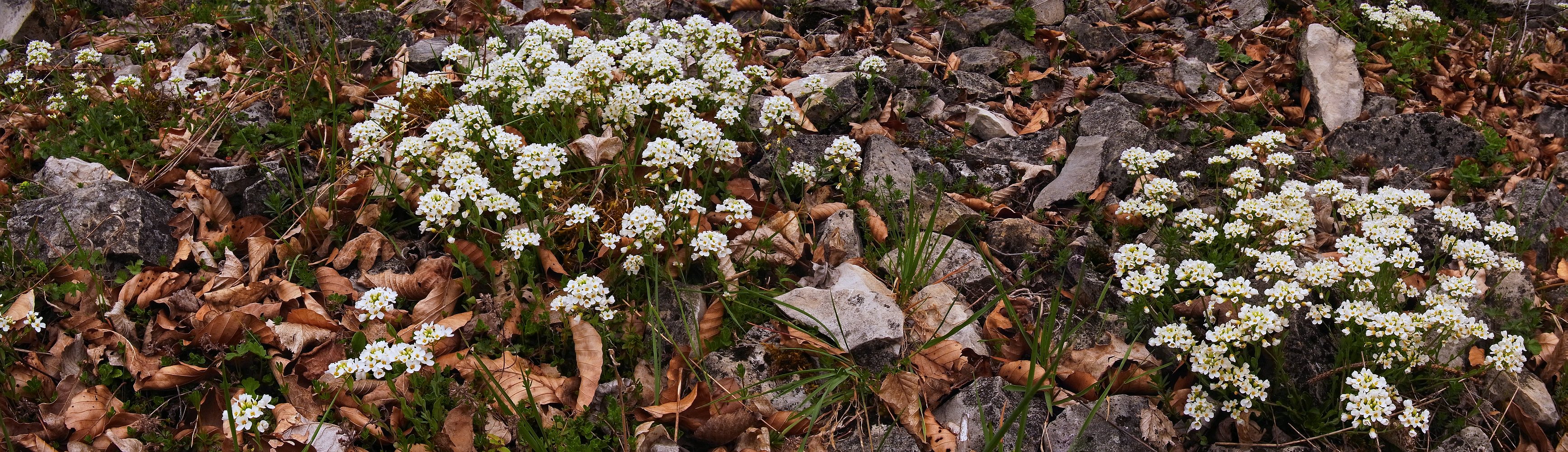 Am Saum der Kalkschotterhalden in der Fränkischen Alb blüht selten im April, teils schon im März das Berg-Täschelkraut (Thlaspi montanum) in kleinen Büscheln. Es handelt sich dabei nicht um eine Alpenblume. In den Alpen wird die Gattung Thlaspi durch andere Arten vertreten.