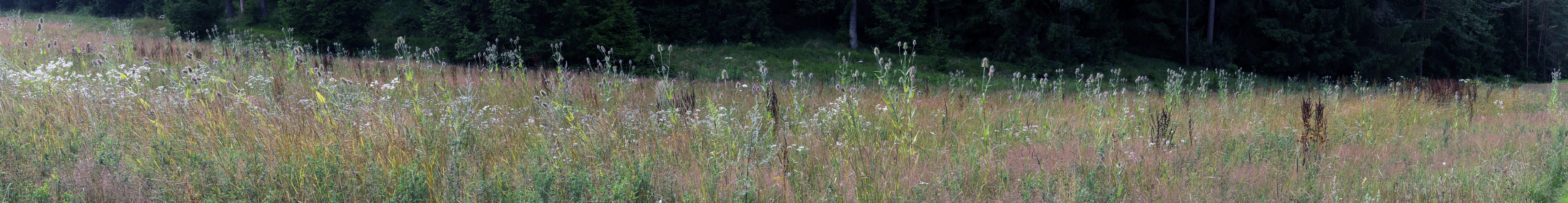 Karden (Dipsacus fullonum) gehören zu unseren imposantesten Wildblumen. Sie können leicht zwei Meter und mehr hoch werden und entwickeln große Blütenköpfe, die sich im Hoch- und Spätsommer öffnen, wobei die Einzeblüten oft nur in einem Ring um den Blütenkopf erscheinen. Ganze Brachfelder oder andere Ruderalstandorte können von ihnen überschwemmt werden. Die weißen Blüten im Vordergrund gehören zum größten Teil zum Einjährigen Berufkraut (Erigeron annuus). Ende Juli 2025.