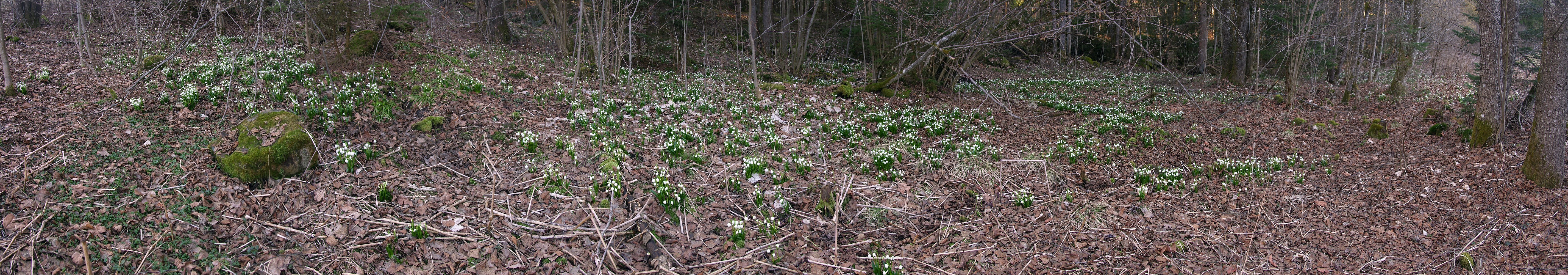Typische Standorte des Märzenbechers (Leucojum vernum) im Bayerischen Wald sind sumpfige Stellen an kleinen Waldbächen, die manchmal, wie in diesem Bild im Hintergrund zu ahnen, nur winzige Rinnsale sind. Anfang März 2026. Weiter