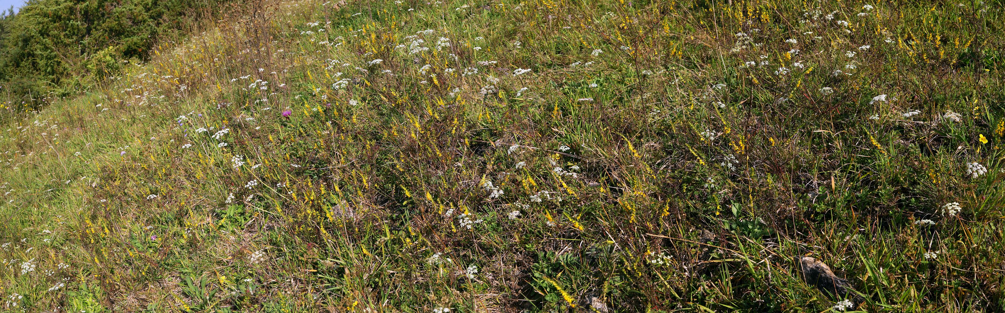 Im Spätsommer blüht auf den Trockenrasen der südöstlichen Fränkischen Alb der Gelbe Zahntrost (Odontotes luteus). Im Jahr 2024 gab es nach einigen mageren Jahren wieder eine reichliche Blüte dieser Pflanze, so dass manche Hänge von weitem schon gelb schimmerten. Hier mischen sich aber die weißen Doldenschirme der Kleinen Bibernelle (Pimpinella saxifraga) in den Zahntrost-Bestand. August 2024.