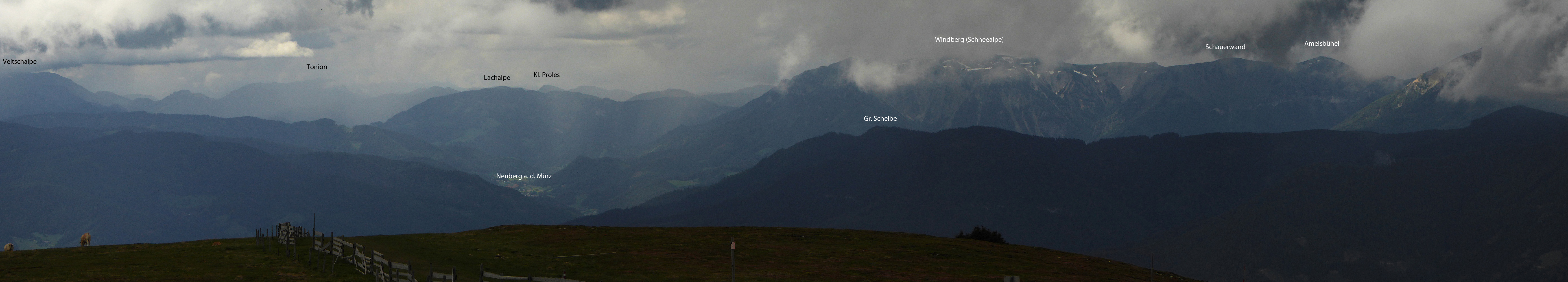 Das Stuhleck (1782m) ist einer der östlichsten bedeutenderen Gipfel der kristallinen Zentralalpen südlich des Semmeringpasses. Es ist auf einer Mautstraße erreichbar. Leider herrschte zum Zeitpunkt der Aufnahme sehr schlechtes Wetter mit düsteren Wolkenstimmungen. Juni 2016.