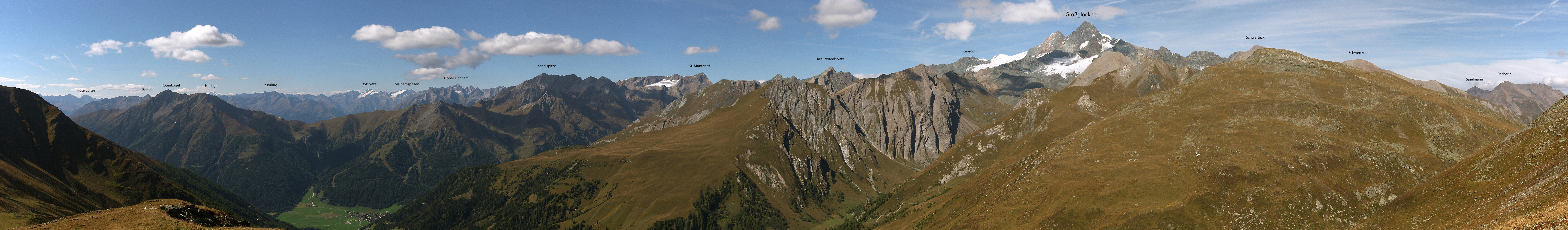 Im Gelände der Tschadinalm hat man den den höchsten Berg Österreichs eindrucksvoll gegenüber (Aufnahme in etwa 2400m Höhe). Links unten im Tal ist ein Teil der Ortschaft Kals in Osttirol zu erkennen. September 2016. Zurück Weiter