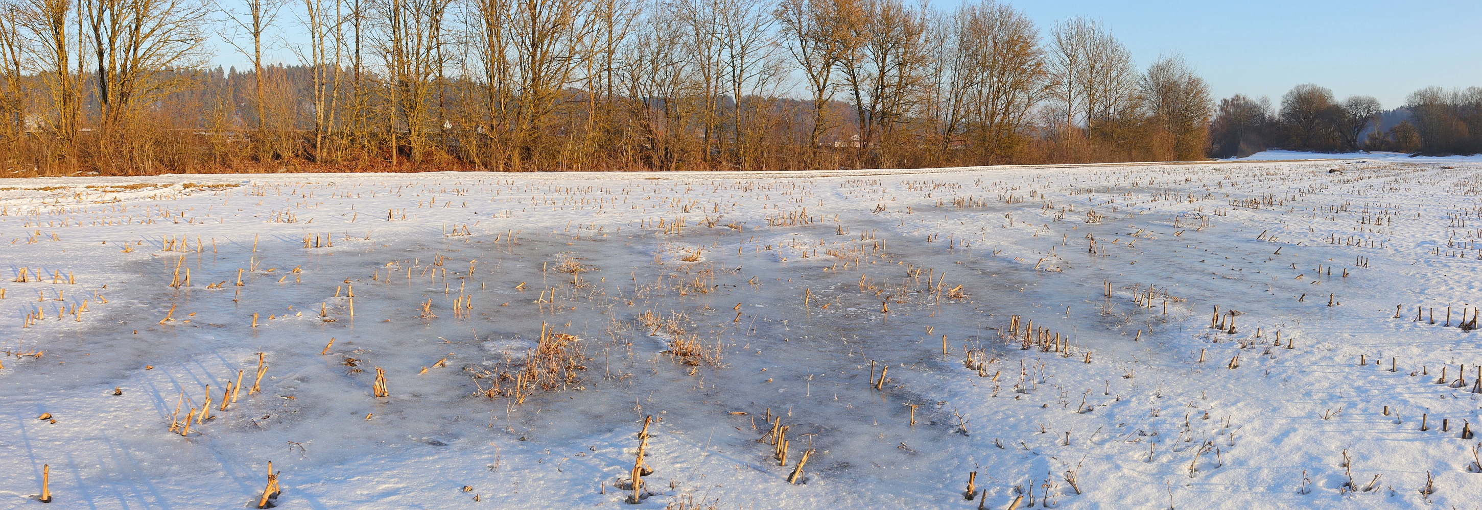 Auf diesem Stoppelfeld war die Pfütze, die sich nach Tauwetter gebildet hatte, wieder zugefroren. Januar 2026. Zurück Weiter