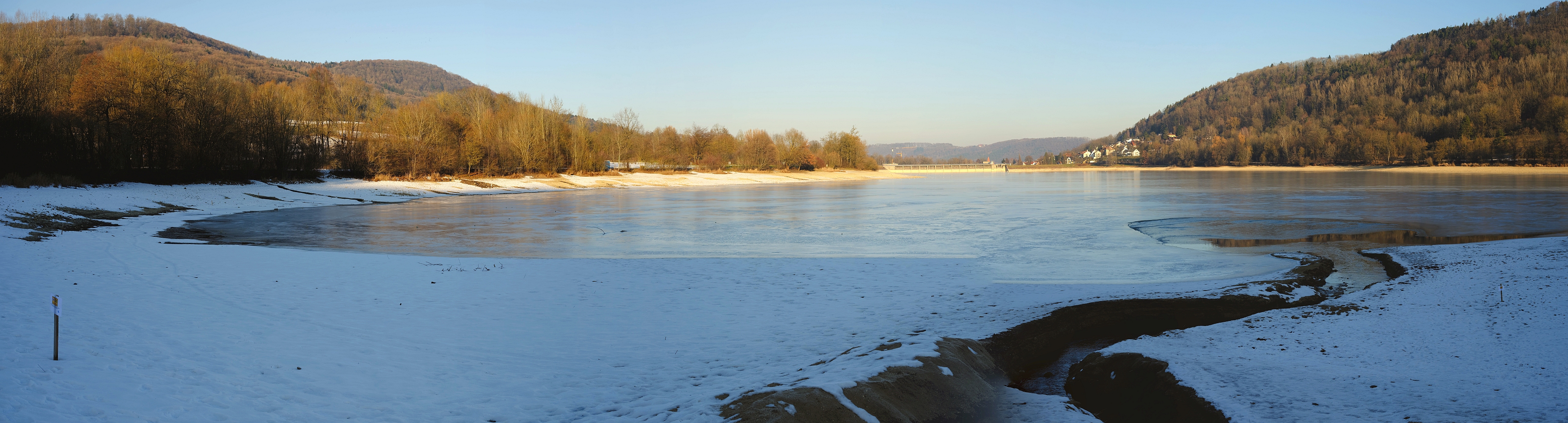 Im Winter 2025/26 war der Happurger Stausee stark abgesenkt wegen Bauarbeiten. Zudem fror er vollständig zu. Bei der Einmündung des Kainsbachs auf diesem Bild wurde der sonst unter Wasser liegende Graben sichtbar, den der Bach erodiert hatte. Januar 2026.